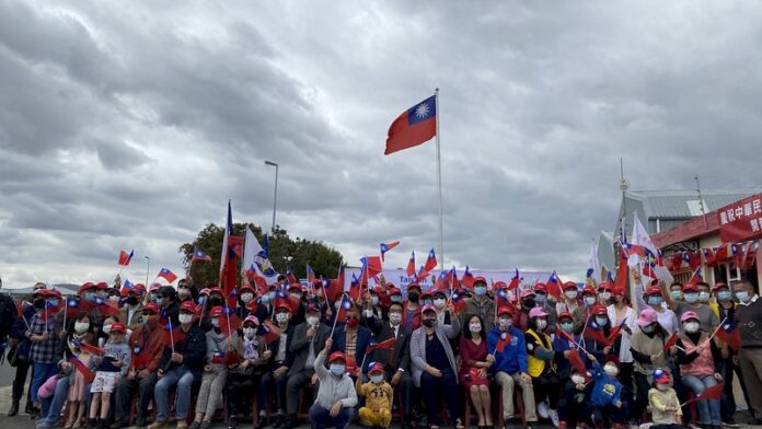 升旗典禮青天白日滿地紅國旗冉冉升起,隨著國旗歌的音樂達到旗桿頂點,迎風飄揚。僑民扶老攜幼出席盛會,不約而同搖動手中的小國旗,同聲祝賀中華民國110年國慶。