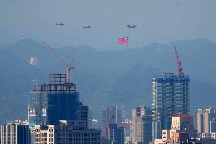 圖為國軍9月30日舉行雙十國慶全兵力空中預演,CH-47運輸直升機吊掛巨幅國旗飛越台北市區。(資料照片/中央社)