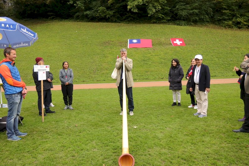 駐瑞士代表處10月8日舉辦國慶運動會,伯恩市長葛拉夫恩里德示範吹傳統樂器阿爾卑斯長號。(圖駐瑞士代表處提供) (圖:中央社)