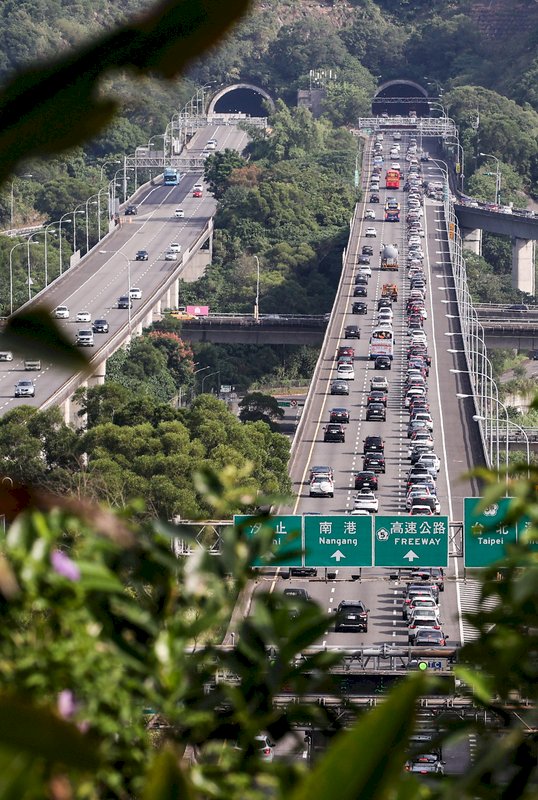 國慶連續假期首日,國道3號9日上午湧現車潮,木柵段往南港轉接國道5號路段出現長長車龍。 (圖:中央社)