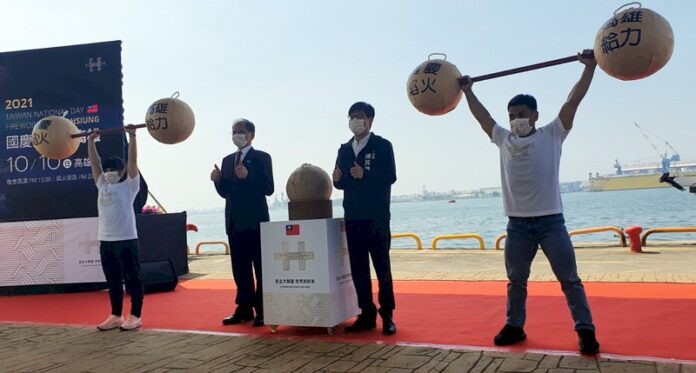 高雄市政府與國慶籌備委員會23日上午在棧貳庫舉行「2021國慶焰火在高雄」記者會,立法院長游錫堃(左2)、高雄市長陳其邁(右2)與東京奧運舉重選手江念欣(左)、高展宏(右)出席並合影。 (圖:中央社)
