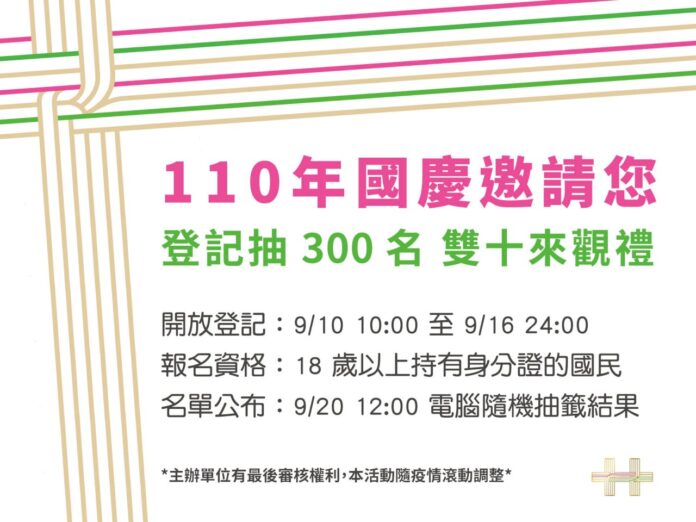 慶籌會表示,國慶官網將從10日上午10時至9月16日24時止開放報名,歡迎年滿18歲且持有我國身分證的國民參加,系統將以電腦抽籤方式,抽出300位幸運民眾,並預計9月20日12時起同時以電子郵件及手機簡訊通知獲選民眾;另為落實防疫措施,獲選的民眾須於9月22日17時前上網填寫「健康聲明書」並點選「確認參加」後始完成報名;未依限填寫者,將視為放棄。