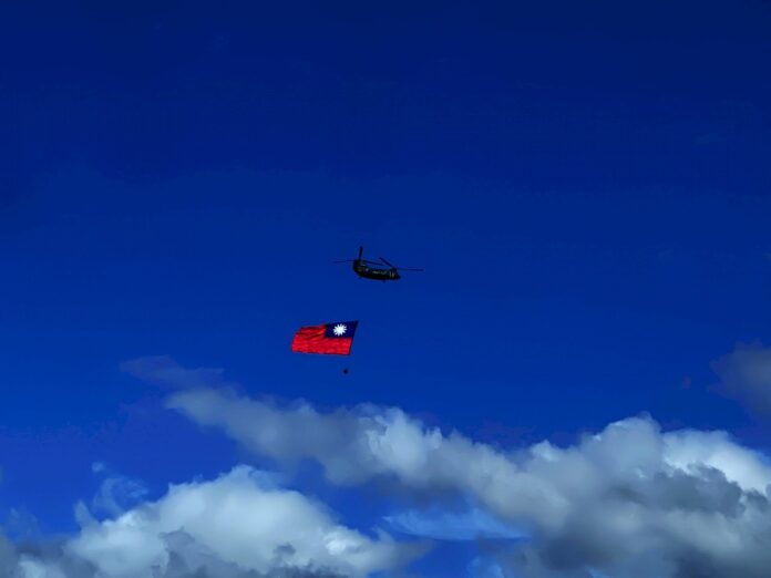 A helicopter towing the national flag beneath it takes part in a rehearsal for National Day celebrations scheduled for Sunday.