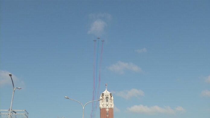 Early Tuesday morning, CH47 helicopters were the first to start National Day rehearsals. They were followed by IDF fighter jets, Mirage 2000 fighter jets and F16V fighter jets. The Thunder Tiger Aerobatic Team has always been one of the highlights of the air show. The jets fly by trailing red, white and blue smoke – the colors of Taiwan’s national flag.