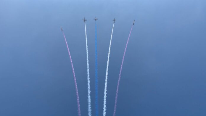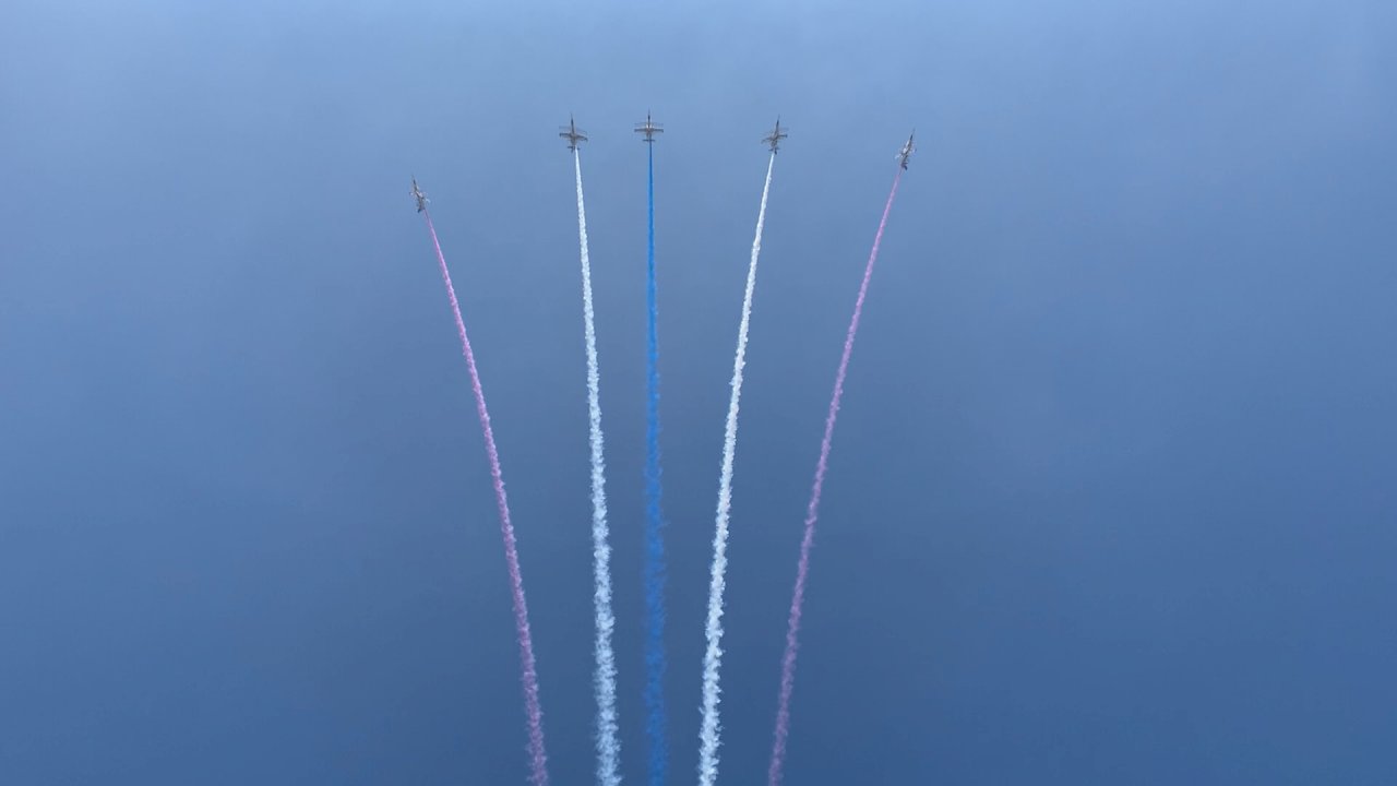 The Thunder Tiger Aerobatic Team zips across the sky, trailing behind smoke in red, blue, and white smoke, the colors of the national flag. A total of 47 aircraft took to the air as part of this exercise, including CH-47 helicopters, IDF fighter jets, Apache helicopters, F-16V fighter jets, and Mirage 2000 fighter jets. The largest existing national flag also made an appearance, suspended from a helicopter.