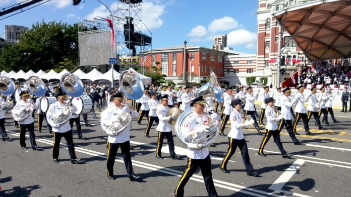 中華民国110年(2021年)双十国慶節祝賀大会は10日、総統府前の広場で行われた。国防部の三軍(陸海空)聯合音楽隊と儀仗隊が一糸乱れぬ行進を披露した。