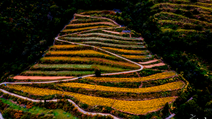 Những hàng hoa cúc vàng tươi nở rộ khắp đồi núi, lung linh toả sáng dưới ánh nắng mặt trời. Đồi hoa cúc này là tại Nông trường Vũ Lăng ở thành phố Đài Trung, bước vào mùa thu, cũng chính là mùa hoa cúc nở, nông trường này càng trở nên hấp dẫn du khách hơn với thiết kế ruộng hoa bậc thang đầy thơ mộng.