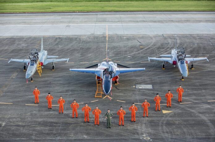 空軍司令部在臉書粉絲團表示,為慶祝中華民國111年國慶大典,空軍第七飛行訓練聯隊受令以勇鷹高教機搭配F-5型戰機,採混合編隊通過總統府上空,為國慶展演拉開序幕。
