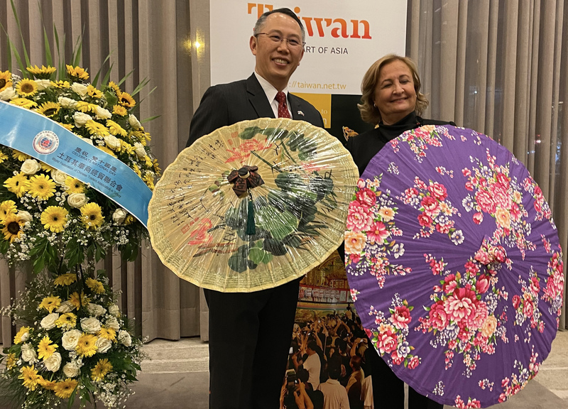 駐土耳其代表處4日國慶晚會場外以客家花布傘及油紙傘布置,駐土耳其代表黃志揚(左)與賓客共持花傘合影留念。(駐土耳其代表處提供) (圖:中央社)