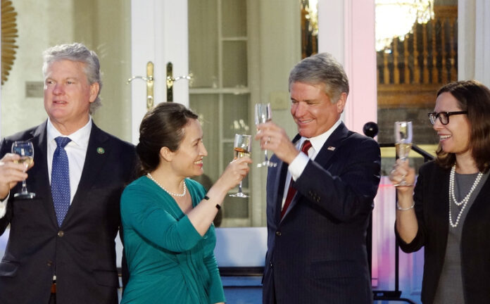 駐美代表處美東時間4日晚間在雙橡園舉行國慶活動,駐美代表蕭美琴(左2)與美國眾議院外委會主席麥考爾(右2)、美國在台協會主席羅森伯格(右)舉杯慶賀。 (圖:中央社)