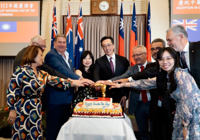 徐佑典夫婦與聯邦眾議院工黨黨鞭史密斯(David Smith)、國會友台小組共同主席巴克霍茲(Scott Buchholz)等嘉賓一同切蛋糕,慶祝中華民國台灣生日快樂。