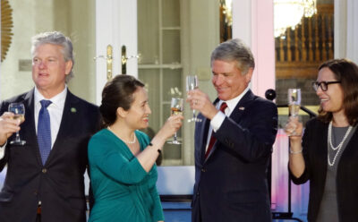 미국 연방 하원 외교위원회 마이클 맥콜(Michael McCaul), 한국계 의원 영 김(김영옥- Young Kim), 인도태평양 소위원회 민주당 수석 의원 아미 베라(Ami Bera). 공화당소속 프렌치 힐(French Hill), 민주당소속 메들린 딘(Madeleine Dean) 등 하원 의원들은 현지시간 지난 4일 워싱턴DC 소재 트윈 옥스(Twin Oaks)에서 열린 쌍십절 국경일 경축연회에 참석하며 연합성명을 발표하고 중화민국 국경일을 축하했다. (주미 중화민국대표부는 현지시간 지난 4일 워싱턴DC 소재 트윈 옥스(Twin Oaks)에서 쌍십절 국경일행사를 개최했다. 샤오메이친(蕭美琴, 좌2) 대사는 미 연방 하원 외교위원회 마이클 맥콜(우2), 미국 재대만협회(AIT) 회장 로라 로젠버거(우1) 등과 함께 축배를 들고 있다. -사진: CNA)