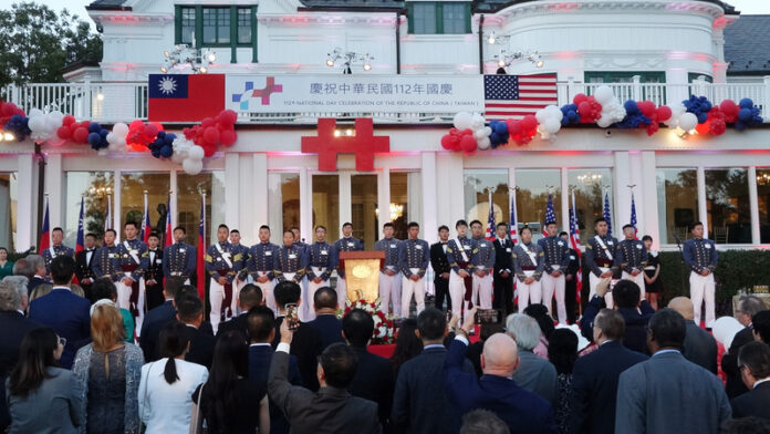 주미 중화민국대표부는 현지시간 지난 4일 워싱턴DC 소재 트윈 옥스(Twin Oaks)에서 쌍십절 국경일행사를 개최했다. 이날 미국 유학 중인 타이완의 사관학교 학생들이 중화민국 국가를 선창했다. -사진: CNA